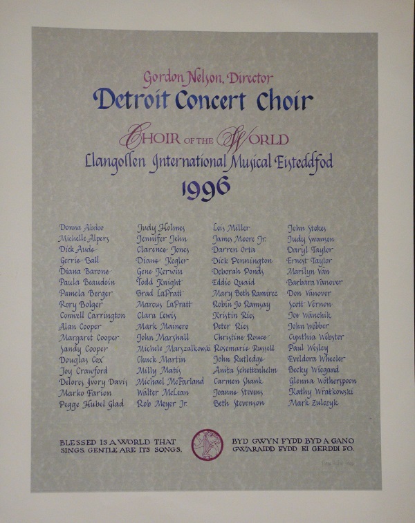 | 1996 | Llangollen International Musical Eisteddfod Llangollen, Wales |